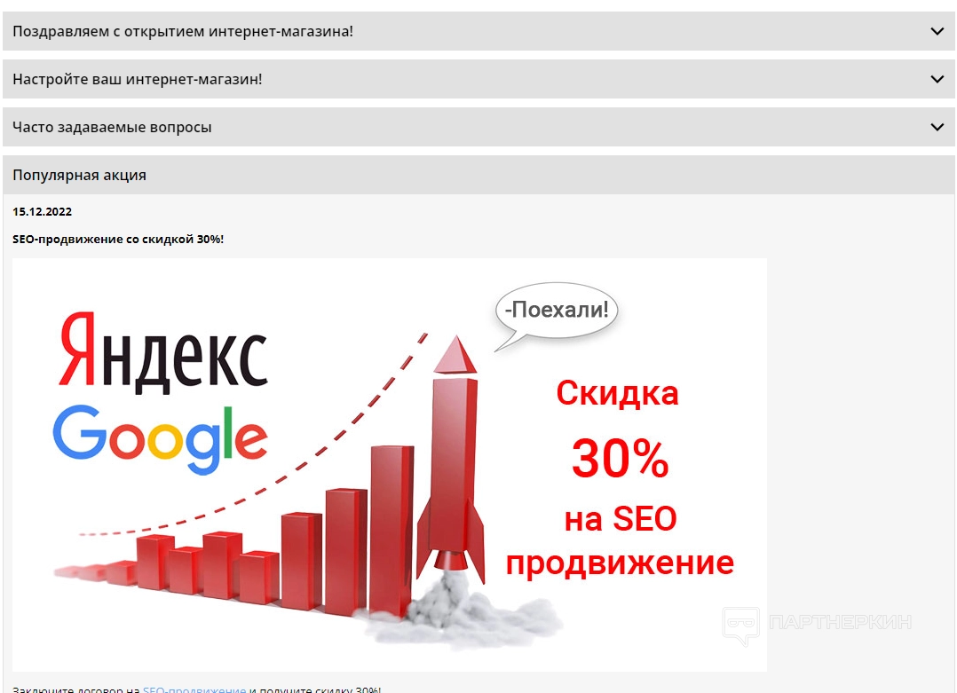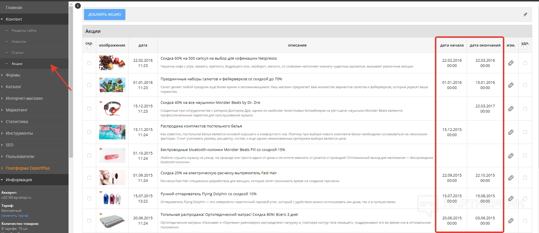 Последняя вкладка — «Акции». Тут размещается информация о распродаже и разных скидках. Материалы в таблице распределены по изображению, дате публикации и описанию. Также стоит обратить внимание на колонки «Дата начала» и «Дата окончания».