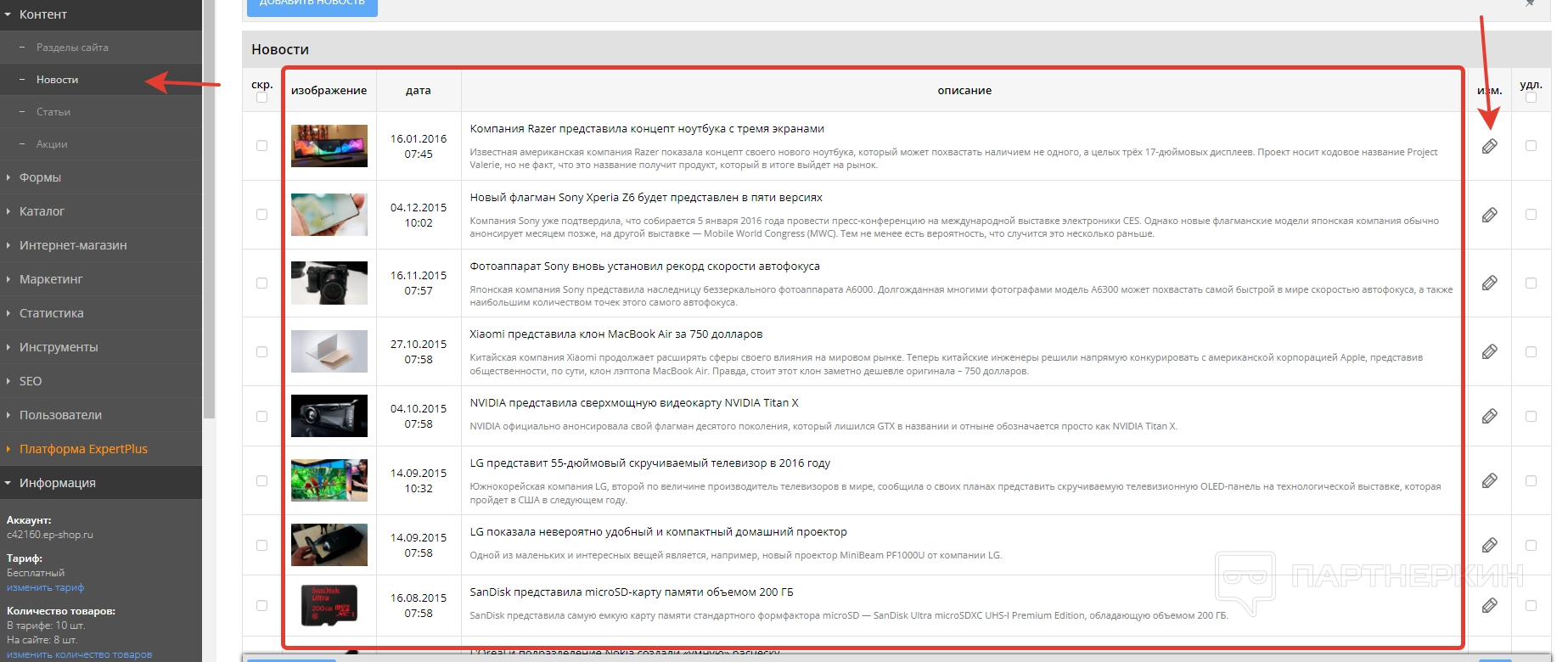 Чтобы изменить новость, кликаем на значок с карандашиком.