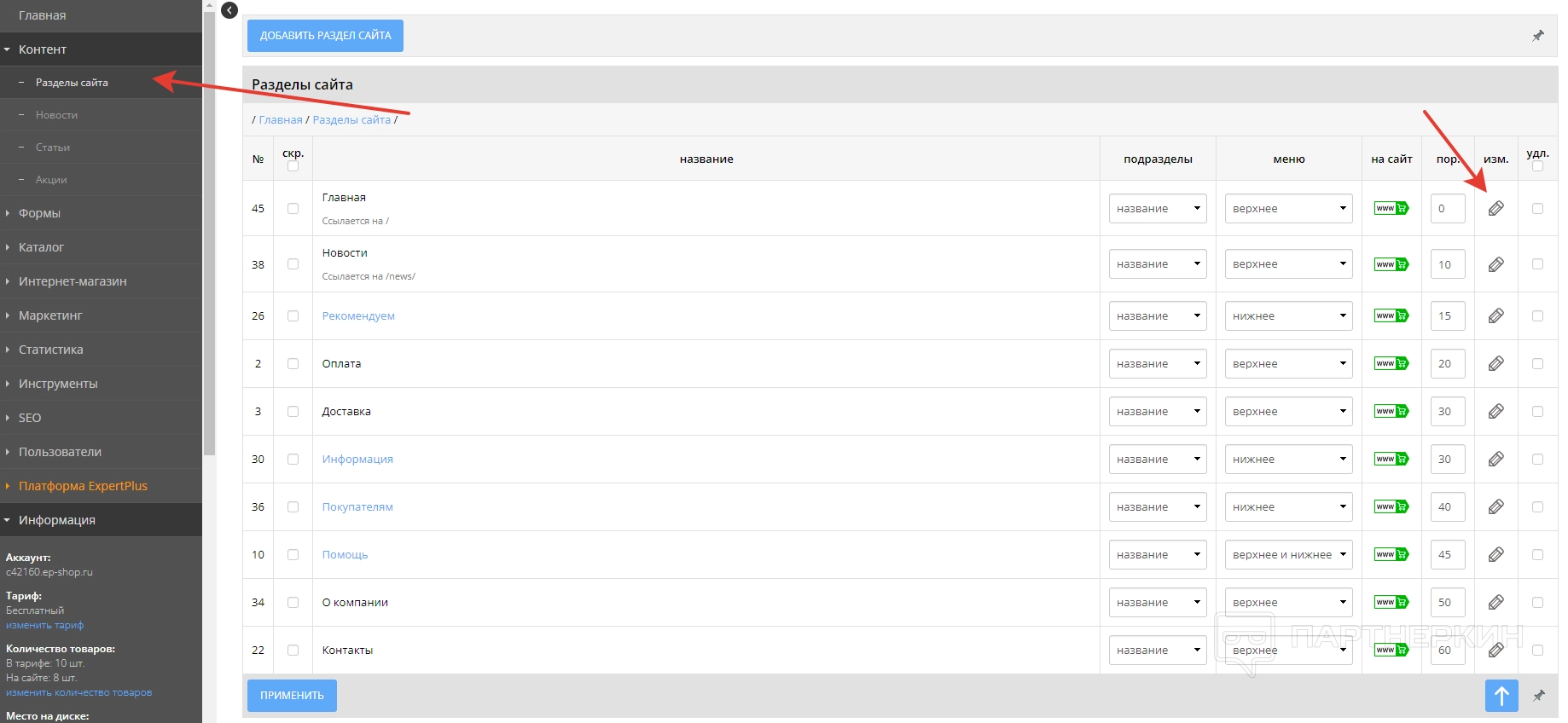 Во вкладке «Разделы сайта» пользователь может настраивать или менять разделы, которые будут отображаться в интернет-магазине. Когда юзер создаст веб-ресурс, система автоматически разместит и назовет разделы по своему усмотрению. Однако это все можно в любой момент изменить.