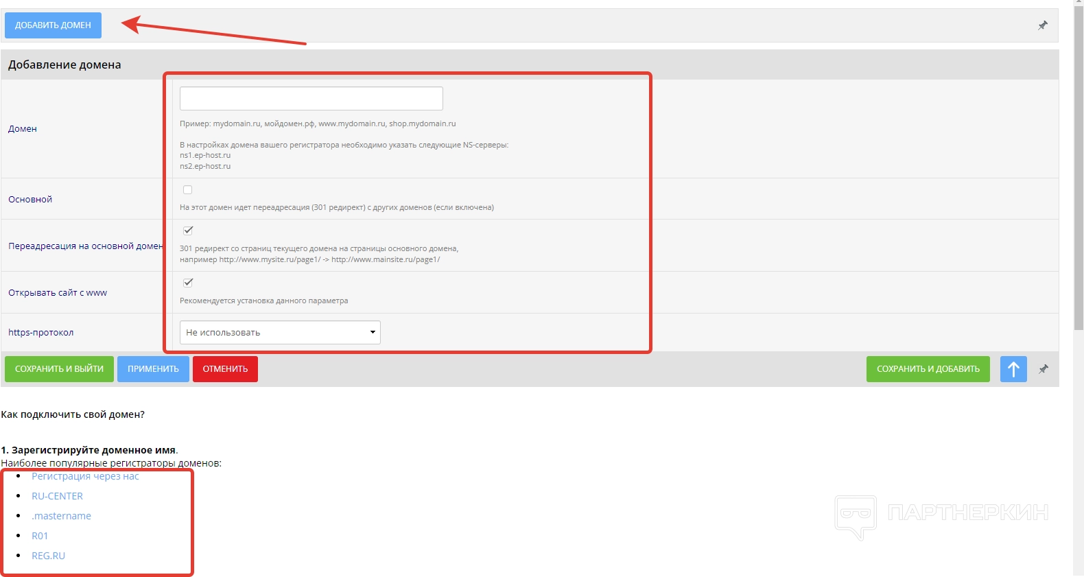 Во вкладке «Домены» можно добавлять доменные имена, используя специальный инструмент. Однако для начала их необходимо зарегистрировать в одном из указанных сервисов.