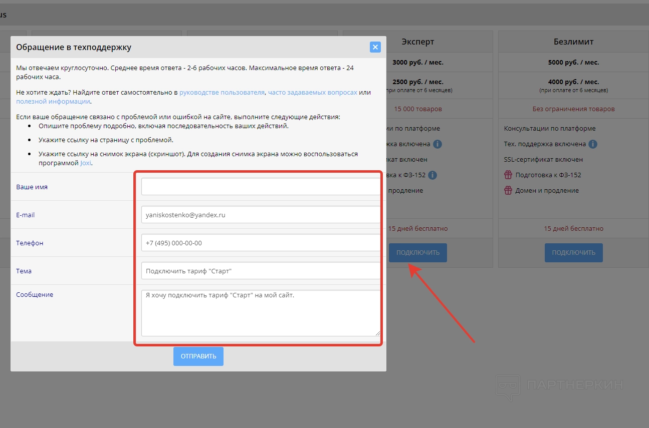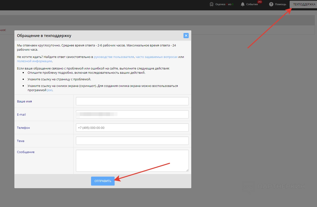 Чтобы начать переписку, которая позже отобразиться во вкладке «Обратная связь», необходимо кликнуть на кнопку «Техподдержка» в правом верхнем углу и заполнить следующие данные: