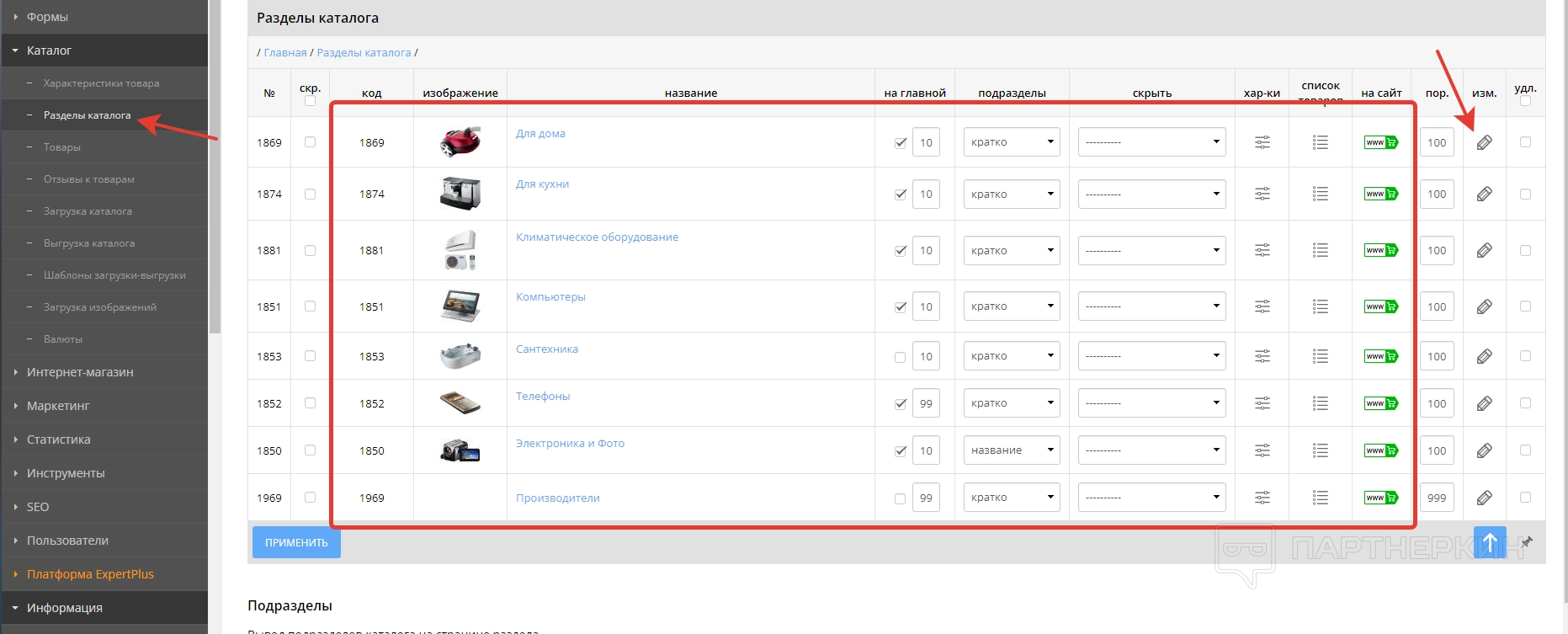 - Каталог . Раздел для работы с ассортиментом, где можно добавлять товары, прописывать их характеристики, добавлять отзывы и многое другое.