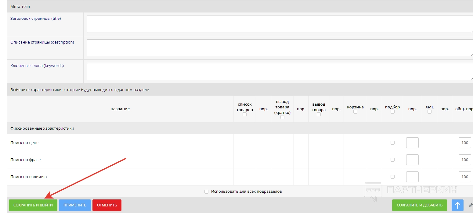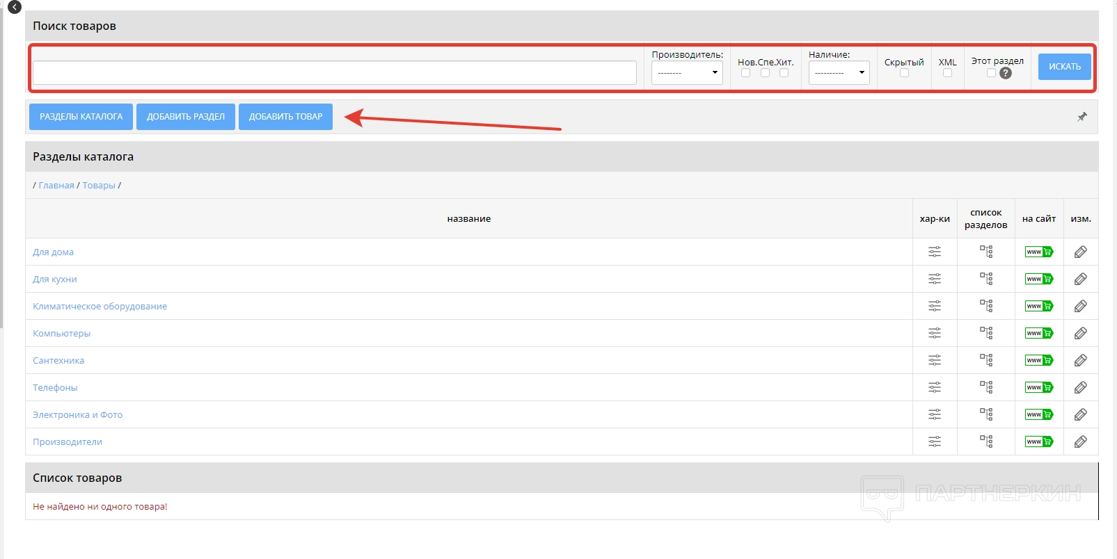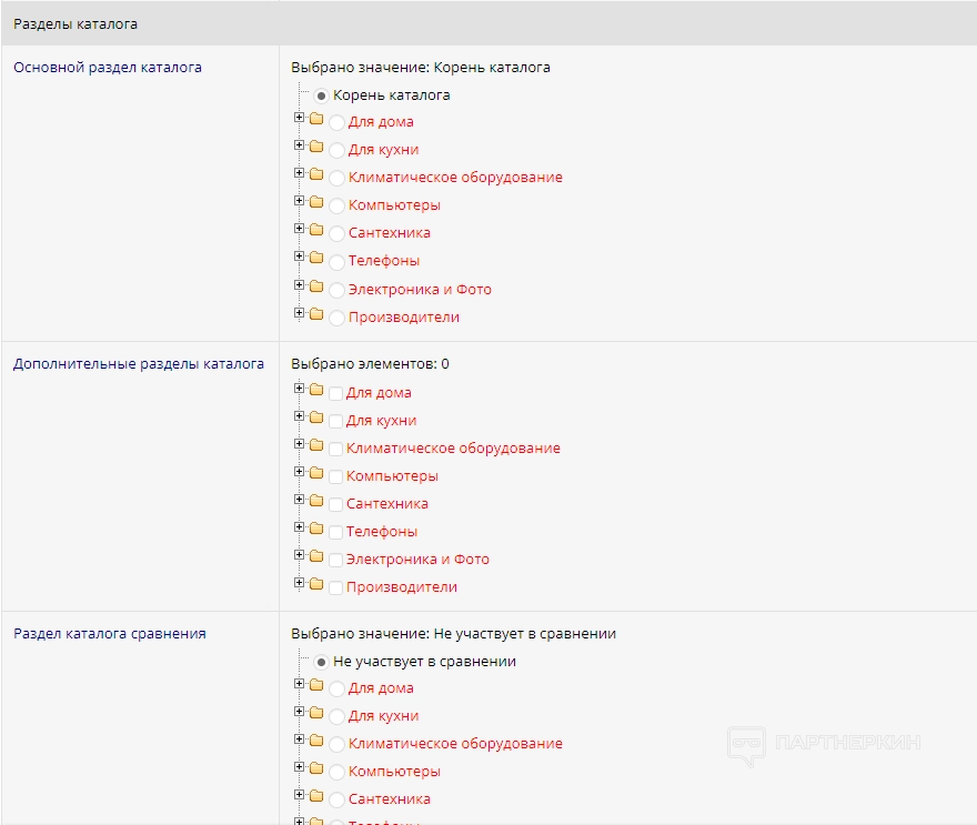 Один из главных разделов, позволяющий работать с товарами. В первой вкладке «Характеристики товара» пользователь может прописывать или редактировать параметры свой продукции. Далее идет вкладка «Разделы каталога», где необходимо настраивать отображение основных разделов товаров.