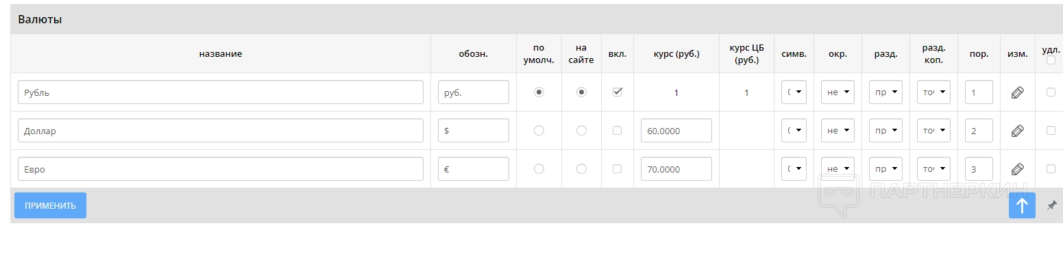 Последняя вкладка — «Валюты». Здесь настраиваются валютные позиции, с которыми готов работать интернет-магазин.