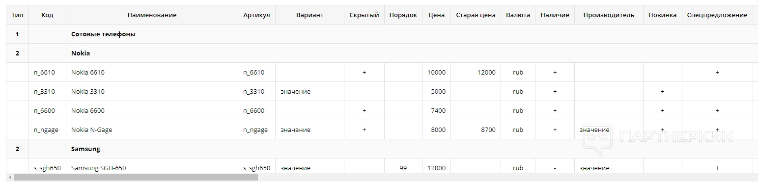 Далее идет вкладка «Выгрузка каталога». Она, наоборот, позволяет выгружать характеристики товаров, используя файлы в формате xls. Выглядеть конечный результат будет следующим образом: