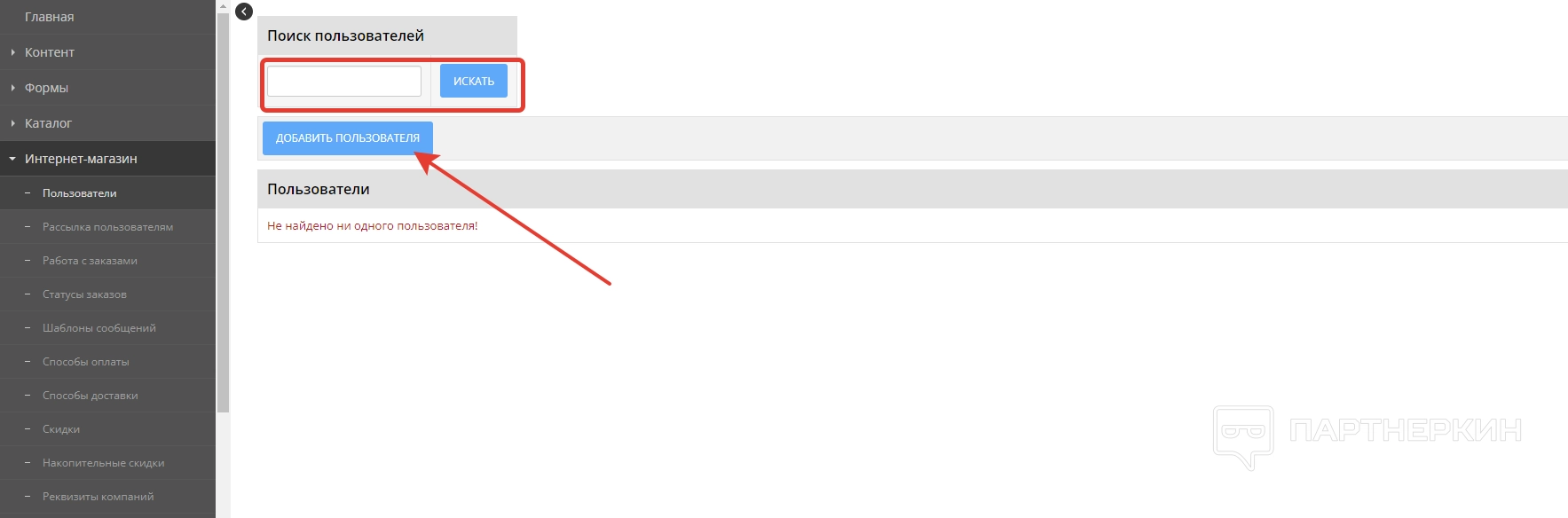 Еще один важный раздел, состоящий из множества вкладок. Сначала идет блок «Пользователи», с помощью которого владелец интернет-магазина может искать конкретных посетителей. Для этого предусмотрена специальная строка. Также есть кнопка для добавления клиентов.