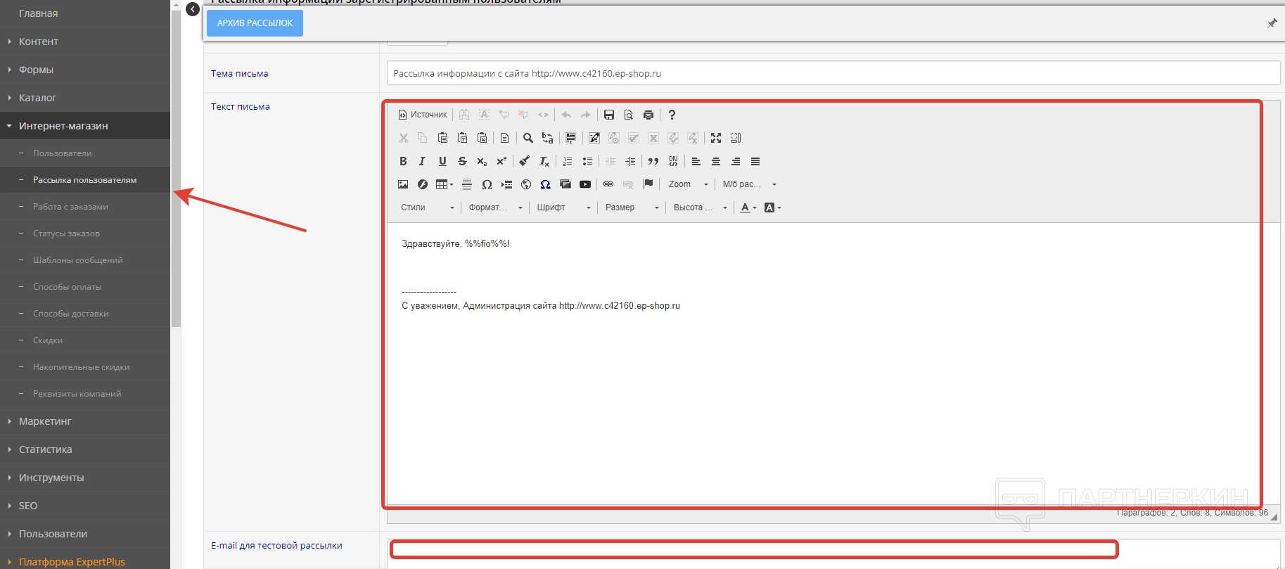 Еще одна важная вкладка — «Рассылка пользователям». Здесь владелец интернет-магазина может создавать шаблоны писем, которые будут рассылаться на электронную почту клиентам.