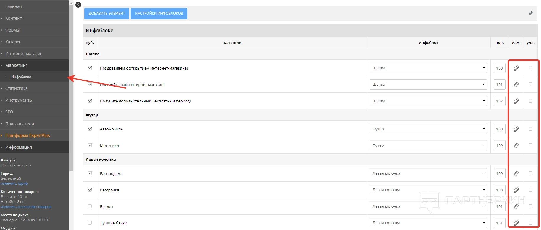 - Маркетинг . Раздел по настройке информационных блоков.