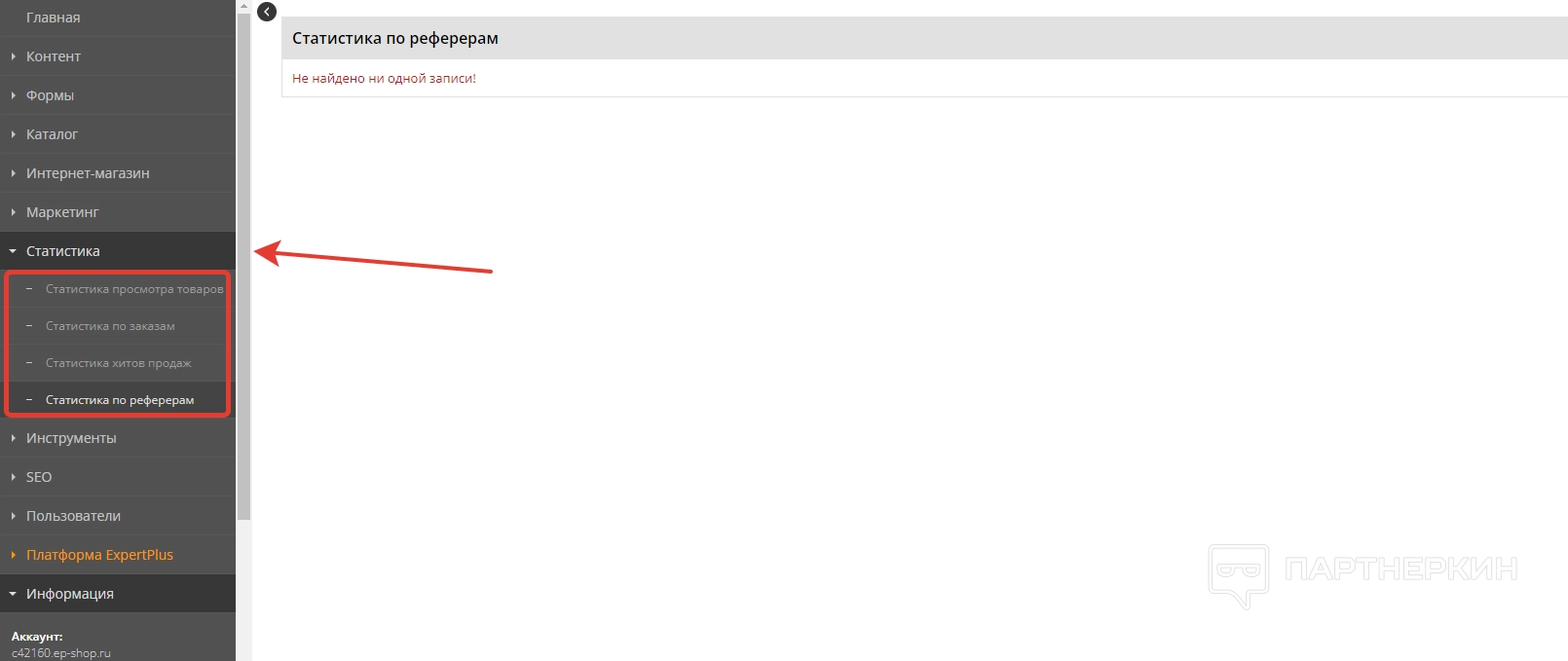 Важный раздел, позволяющий работать с отчетами. Статистика предоставляется по просмотрам товаров, заказам, хитам продаж и реферерам. Для переключения параметром используются соответствующие вкладки.