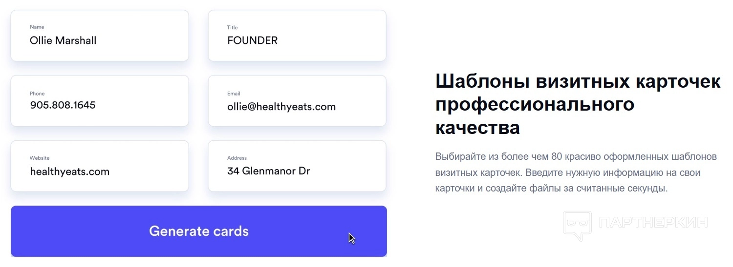 Дизайны визитных карточек поставляются в формате PDF с лицевой и оборотной сторонами в одном файле. Можно выбрать один из более чем 80 различных шаблонов визиток. Looka интегрирована с Zazzle. Как только клиент сделает дизайн, он может нажать «Заказать печать» и перейдет в Zazzle. Там можно указать размер визитной карточки, количество, качество бумаги для печати.