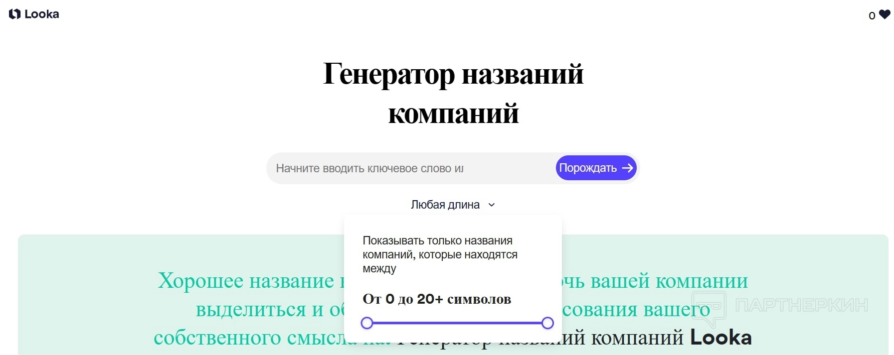 Отличие генератора нейминга Looka от конкурентов: большинство онлайн-генераторов названий просто добавляют случайные слова к ключевому слову. В итоге получается банальное или случайное бессмысленное название. Looka обновляет и обучает свои алгоритмы работать с ключевыми словами, предоставляет широкий спектр названий и типов: придуманные, многословные, традиционные и другие.
