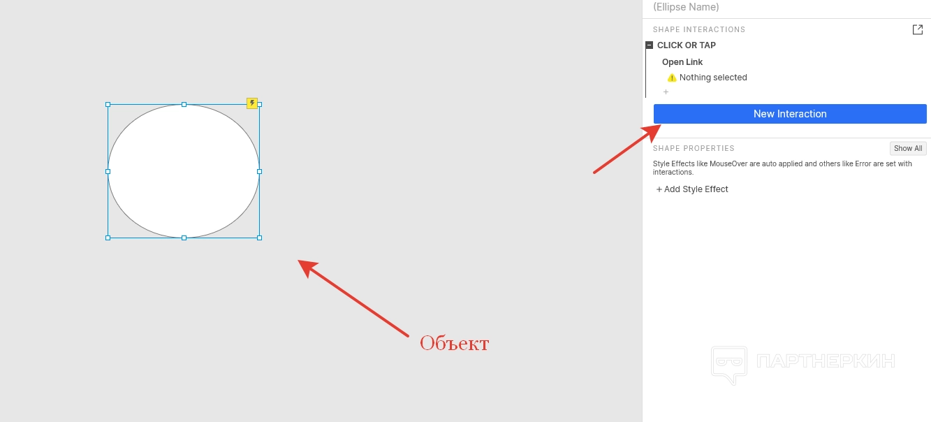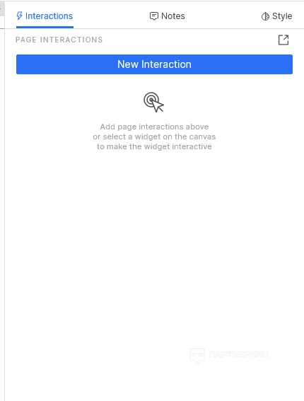 Чтобы привязать к созданным прототипам определенные действия, необходимо воспользоваться интерактивными блоками. Для этого выделяем мышкой нужный объект, переходим в правую часть экрана и жмем на «New Interaction».