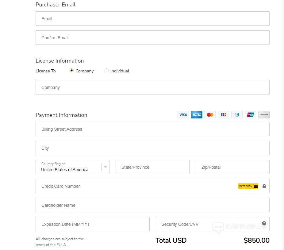 Выбрав подходящий тариф, кликаем на соответствующую кнопку и заполняем форму с личными данными и реквизитами. Обязательно нужно указать электронную почту и название компании. Для оплаты услуг используются банковские карты Visa, Mastercard, JCB, Discover, American Express, UnionPay. Карты РФ не поддерживаются.