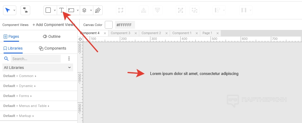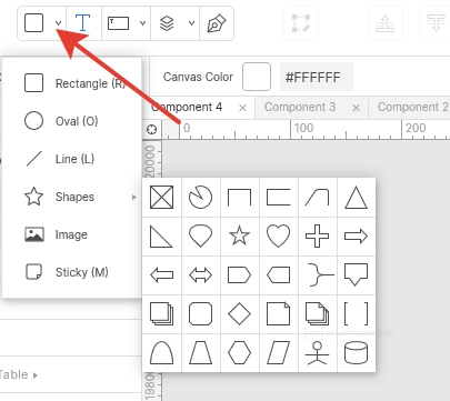 - Инструменты . Здесь находятся инструменты для создания различных объектов в рабочей зоне. Это различные фигуры, текстовые вставки, динамические панели, списки и прочее.