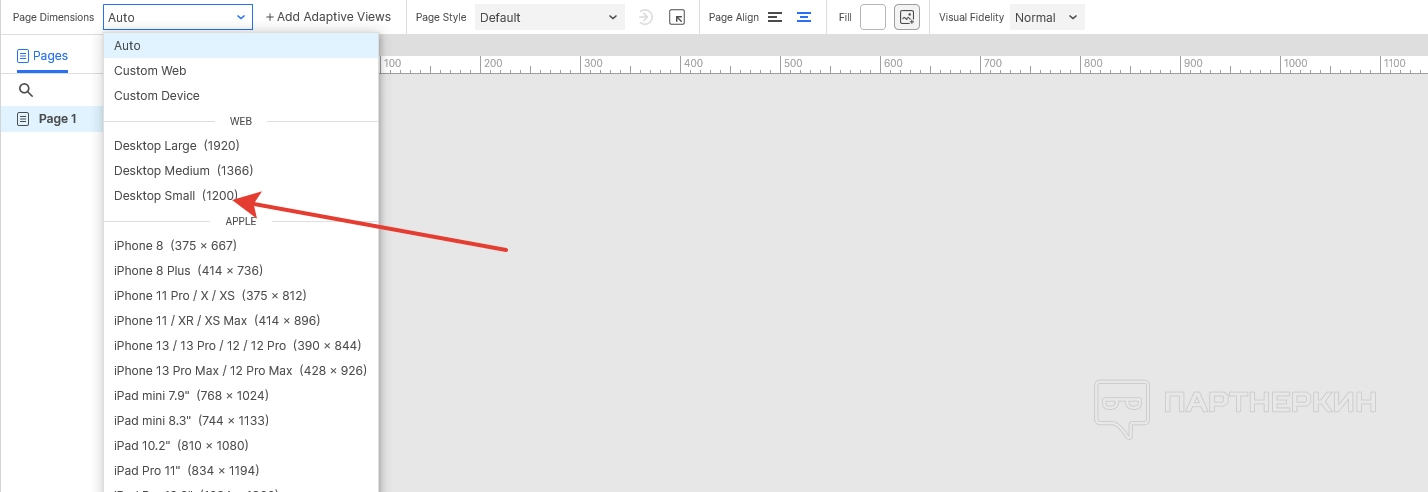 Выбираем, например, вариант «Desktop Small (1200)» и ждем, когда система автоматически подгонит размер рабочего поля под выбранные параметры.