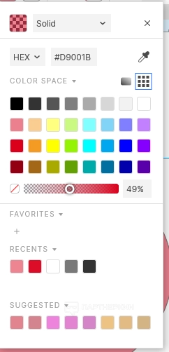 Добавленный овал можно залить цветом. Для этого кликаем в центре фигуры левой кнопкой мыши, поднимаемся к панели инструментов и жмем на белый квадрат возле надписи «Fill». Далее откроется меню, где можно выбрать цвет, указать его насыщенность, прозрачность и прочие параметры. Выбираем, допустим, красный цвет и регулируем ползунок таким образом, чтобы он оказался в центре полосы. Это позволит установить баланс между прозрачностью и насыщенностью.