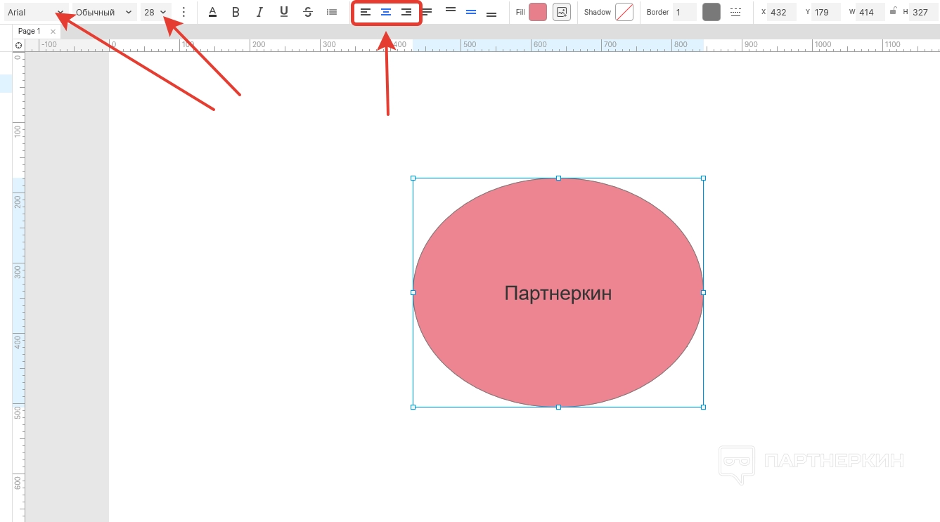 Добавленный овал теперь будет бледно-красным цветом. Далее можно вставить в него какой-нибудь текст. Для этого перемещаем курсор в середину фигуры, дважды кликаем на левую кнопку мышки и вписываем текст. В панели редактирования страницы выбираем шрифт, размер, устанавливаем расположение текста (центр или по краям).