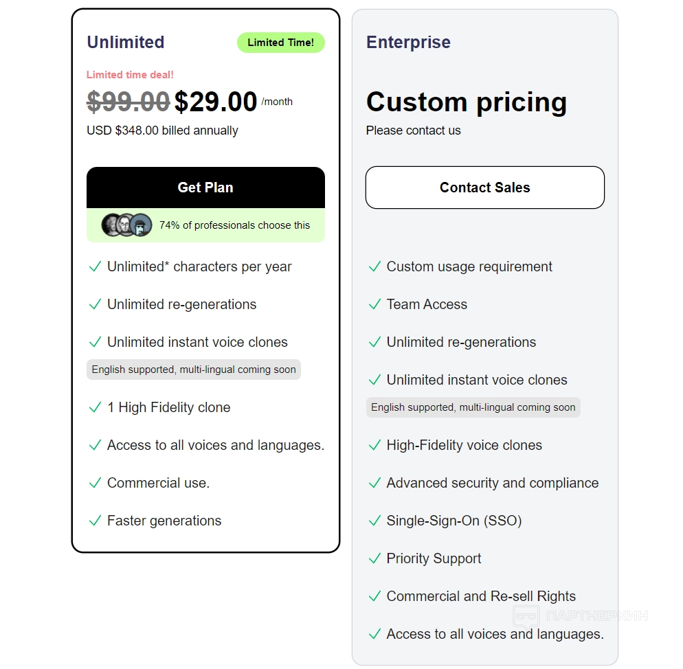 План Unlimited стоит $29,00 в месяц (обычная цена: $99,00) или $348 в год. Предложение включает неограниченное количество символов в год, неограниченные генерации, неограниченное количество мгновенных голосовых клонов и другие преимущества, что делает этот тариф популярным выбором среди профессионалов.