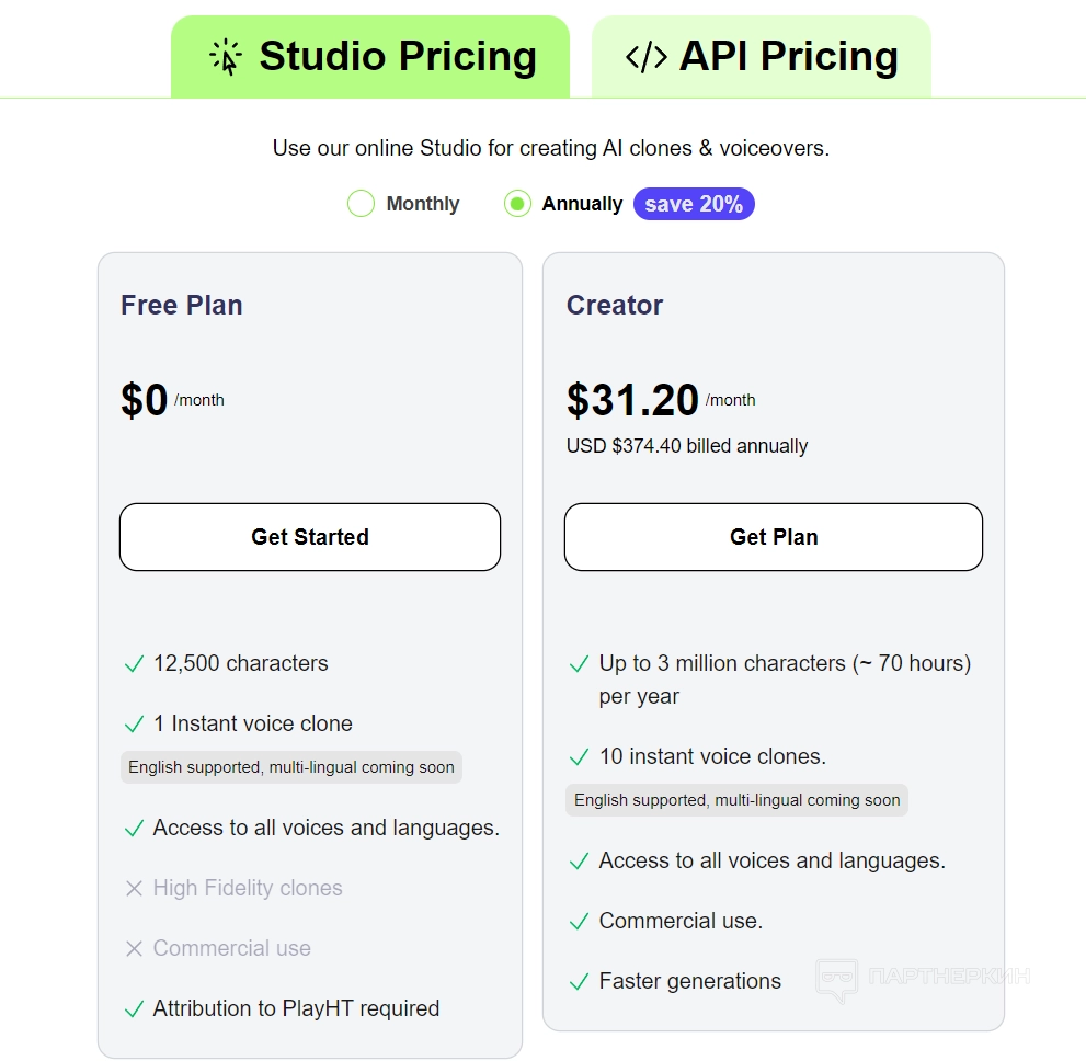 План Creator предлагает более расширенные возможности за $31,20 в месяц или $374,40 в год. В рамках этого плана пользователь получает возможность использовать до 3 миллионов символов в год, имеет доступ к 10 мгновенным голосовым клонам и может использовать их в коммерческих целях.