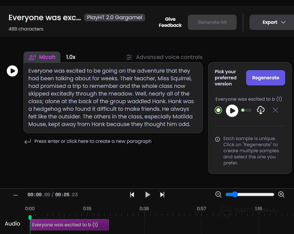 Сервис использует искусственный интеллект для преобразования текста в речь. Это позволяет создавать аудиоконтент с естественным и выразительным звучанием, что делает информацию более доступной и понятной для пользователей. С PlayHT можно легко и быстро озвучивать любые текстовые материалы, от статей и блогов до инструкций и учебных курсов.