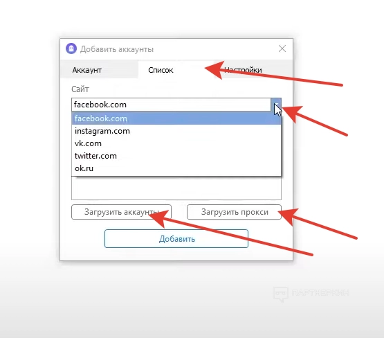 После нажатия на кнопку появится небольшое окно со вкладками «Аккаунт», «Список» и «Настройки». Во вкладке «Аккаунт» выбираются социальные сети, для которых подключается аккаунт. По умолчанию