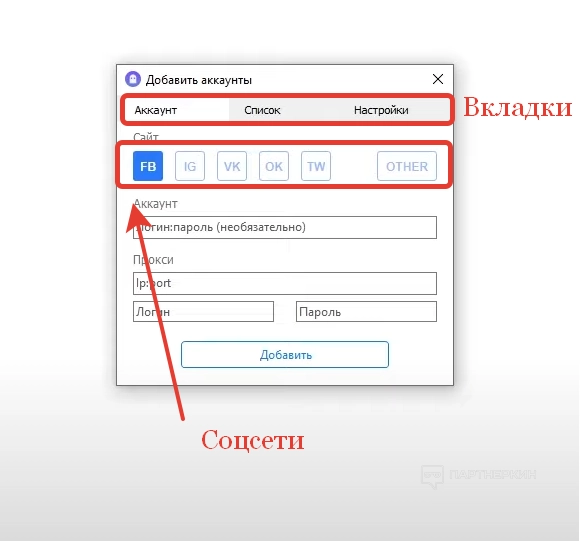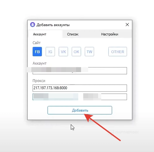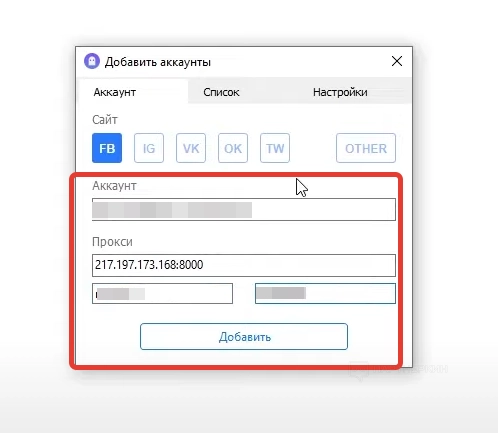 Чтобы добавить аккаунт, нужно вписать логин и пароль от профиля. Также потребуется вставить прокси и логин/пароль от него.