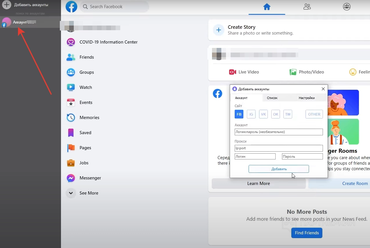 Далее программа сразу откроется аккаунт от выбранной социальной сети в своем интерфейсе. Стоит обратить внимание на левую часть экрана, в которой под кнопкой «Добавить аккаунты» появится новый аккаунт.