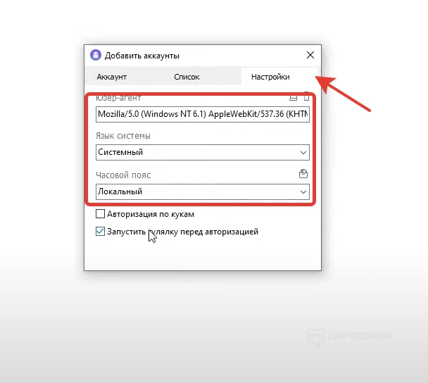 Последняя вкладка «Настройки» позволяет выбирать юзер-агент, язык системы и часовой пояс. Также там можно установить авторизацию с помощью заранее подготовленных куки.