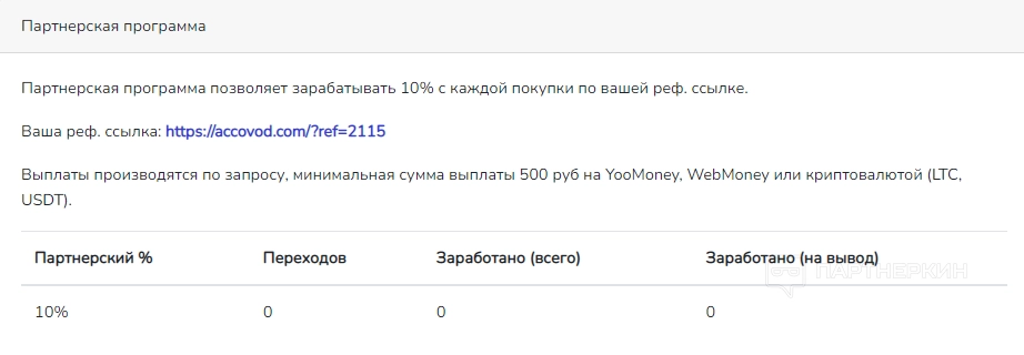 Второй блок рассказывает об условиях партнерской программы. Там указана реферальная ссылка и есть информация о том, что владелец аккаунта может зарабатывать до 10% с каждой покупки привлеченного пользователя. Вывод осуществляется на кошельки WebMoney, YooMoney и USDT. В нижней части блока отображается количество переходов и заработанных средств.