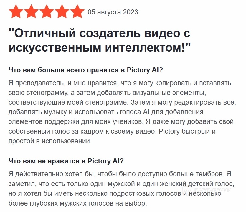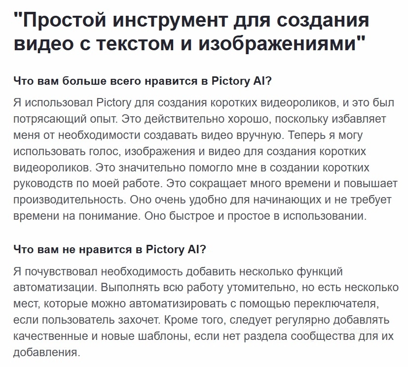 Другие пользователи отмечают, что Pictory хорошо подходит для создания видео руководств, экономит время и силы: