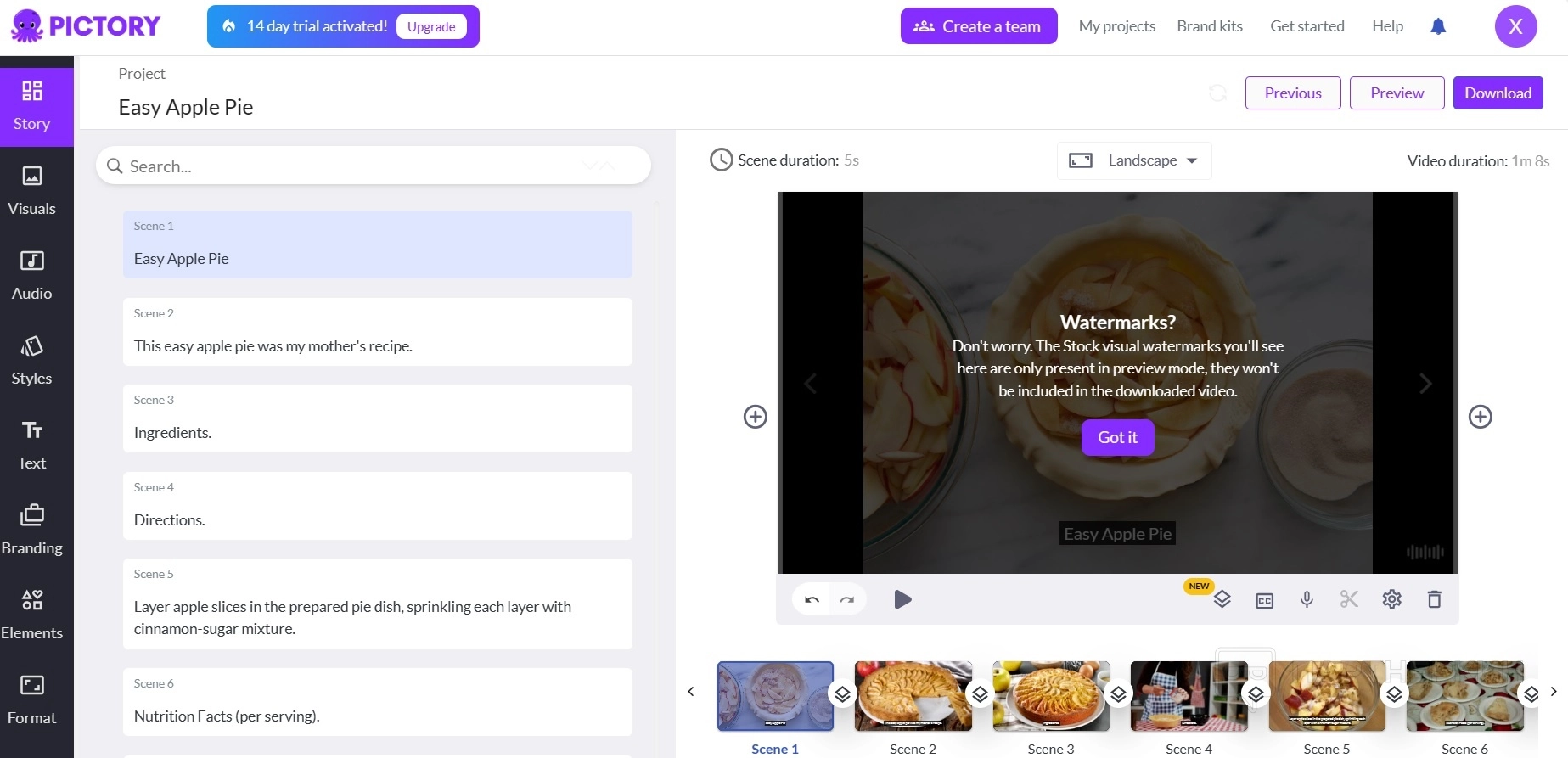 - Контролировать все аспекты рабочего процесса с видео, получать необработанные материалы, организовывать, размещать и совместно создавать раскадровку, не выходя из Pictory.