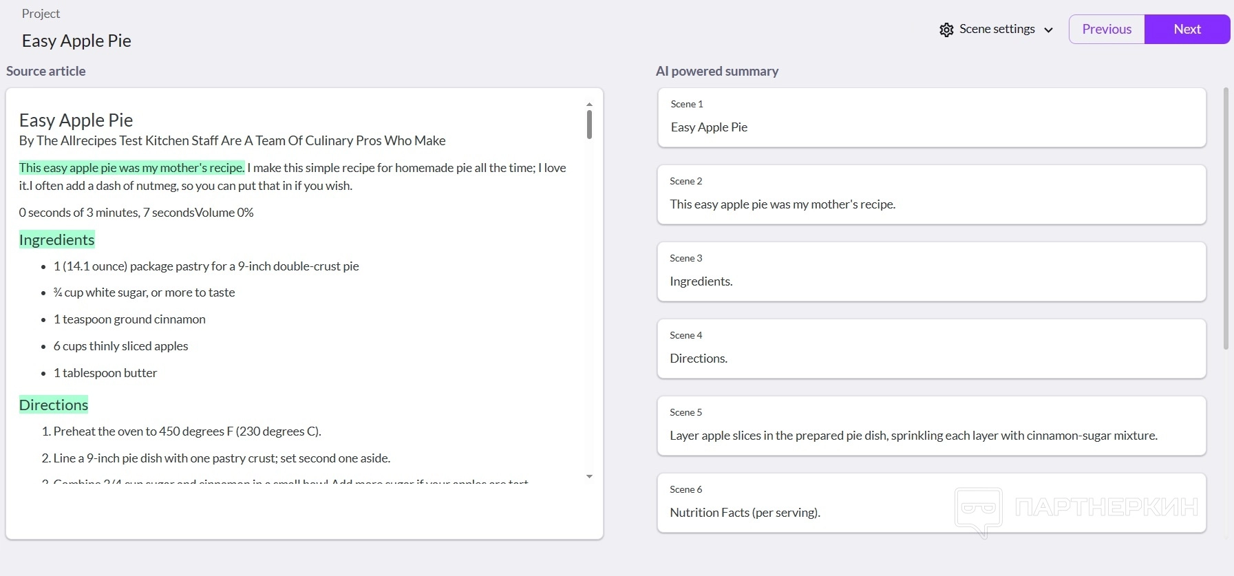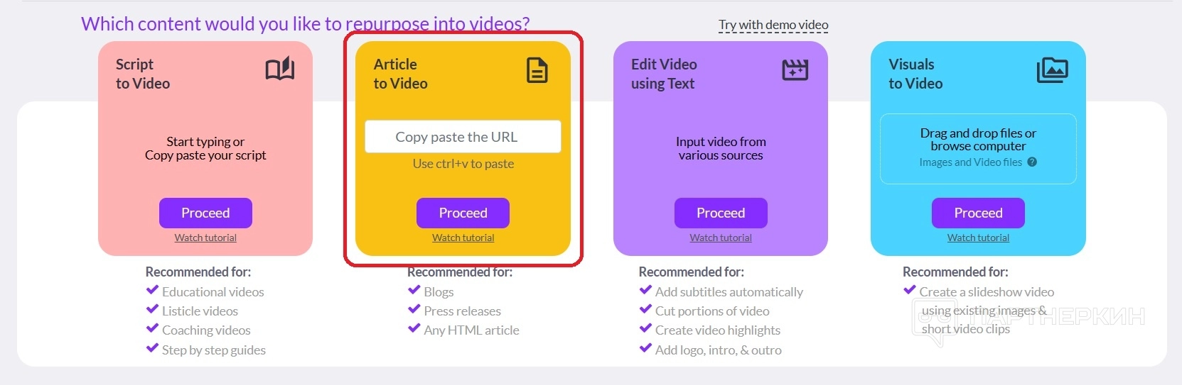 Например, для преобразования статьи в видео нужно кликнуть на соответствующий раздел. Далее нужно вставить ссылку на статью. Затем нужно подождать, пока Pictory извлечет из статьи ключевые слова для понимания темы видео.