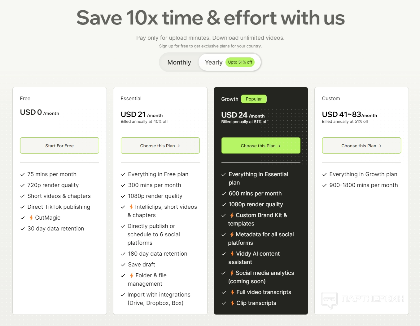 Включает в себя все возможности плана Growth и увеличивает время редактирования до 900-1800. |