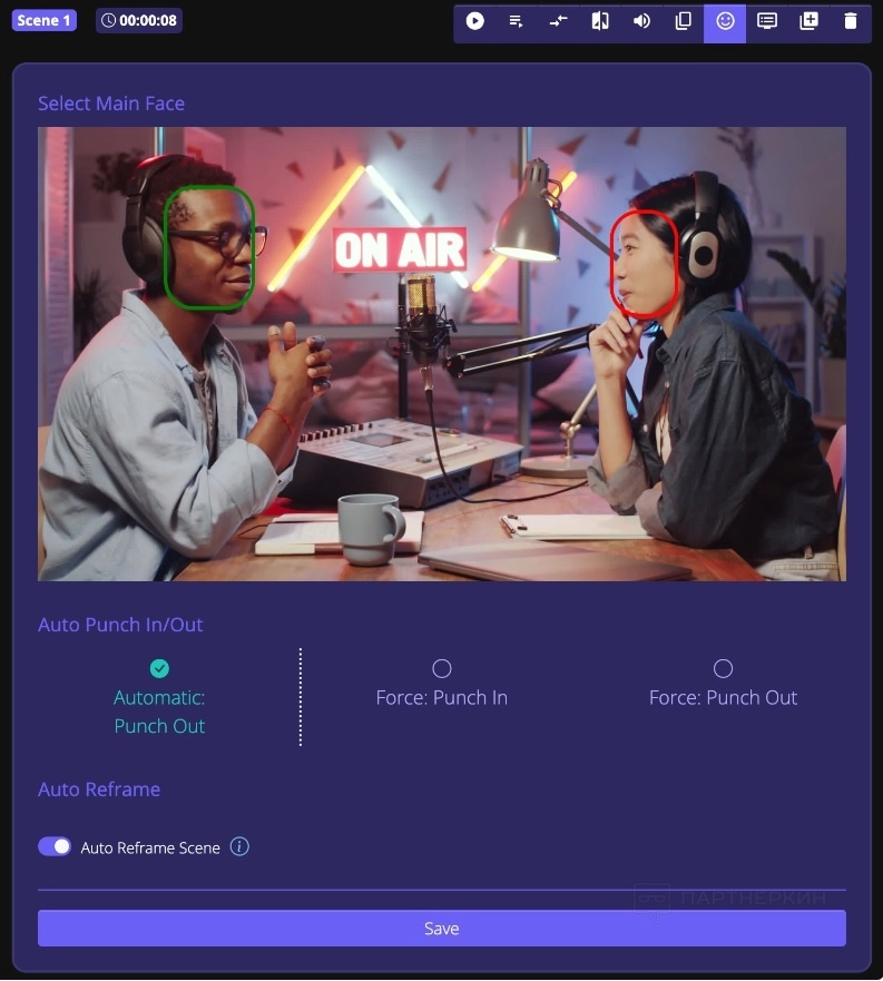 Если есть несколько лиц в видео, то будет возможность выбрать, на каком лице нужно сфокусироваться в Punch-in или Auto Reframe. По умолчанию
