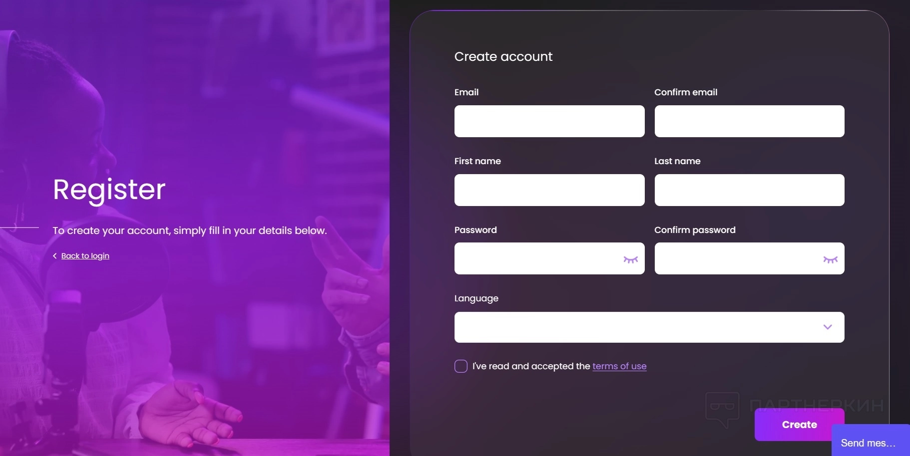 Введите адрес электронной почты, пароль, имя и фамилию. Выберите язык. Примите условия использования и нажмите «Создать».