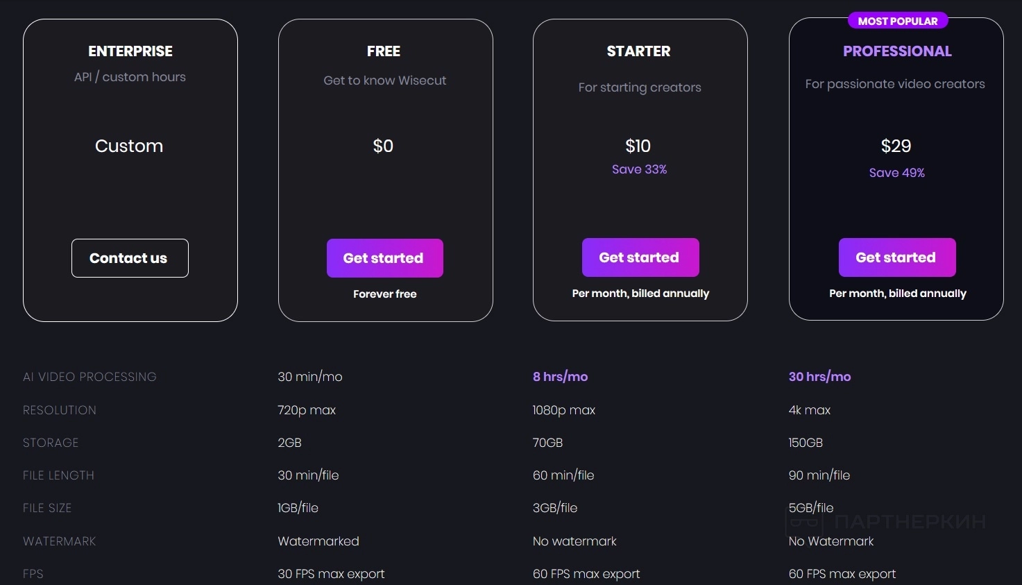 - Профессиональный — $29/мес. Включает 30 ч/мес, 4k макс., 150 ГБ, 90 мин/файл, 5 ГБ/файл, без водяного знака, 60 кадров в секунду макс. экспорт.