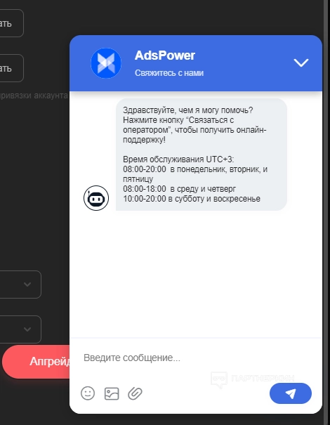 Тут же появится диалоговое окно для беседы с чат-ботом. В нем можно ознакомиться с графиком работы службы поддержки. Бот отвечает практически сразу. Если вопросы сложные, система свяжет пользователя со специалистом.
