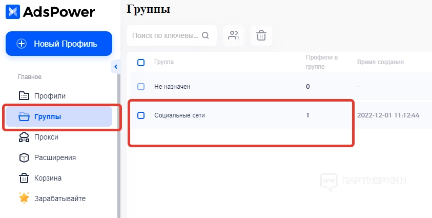 - Группы . В этой вкладке отображаются папки, в которые входят определенные группы профилей. Папки эти создаются во время настройки каждого профиля.