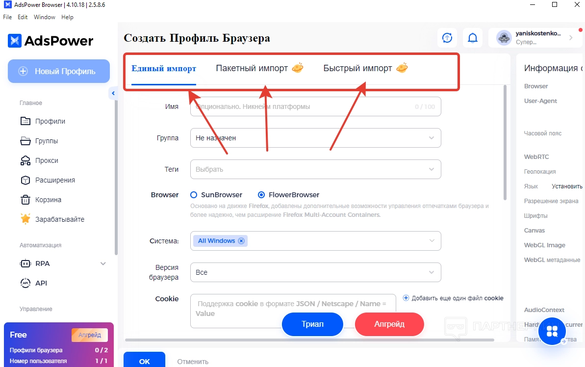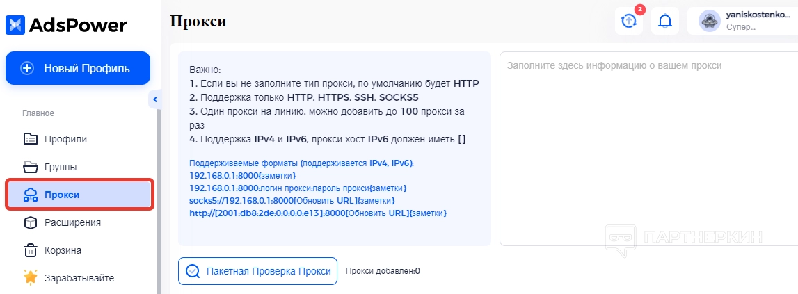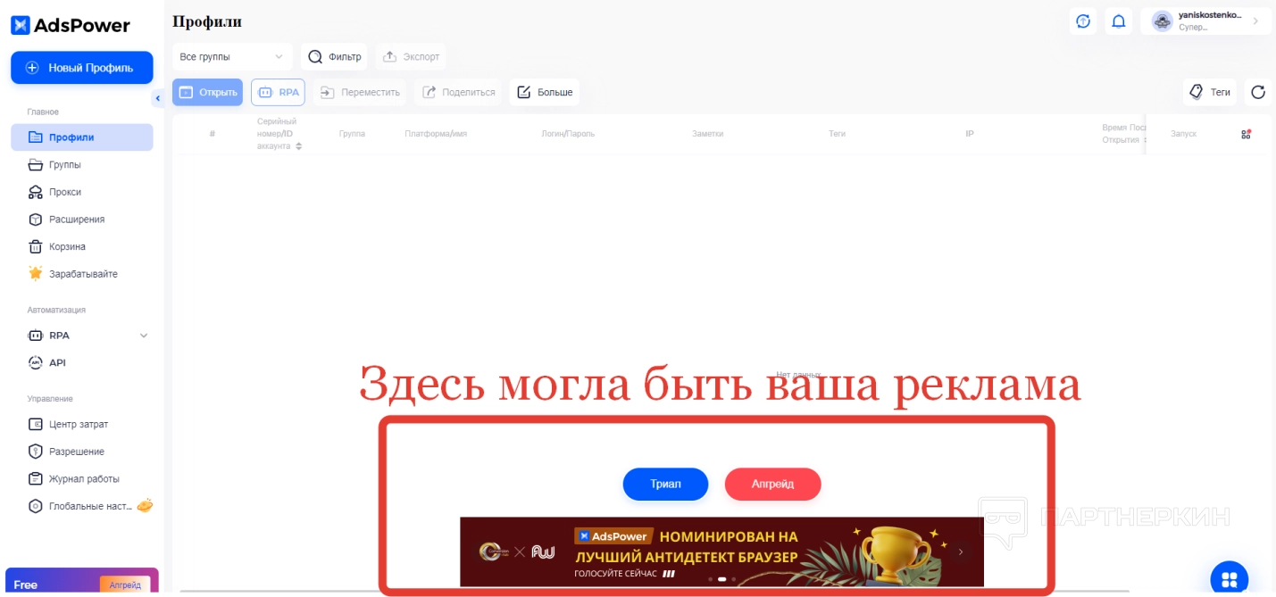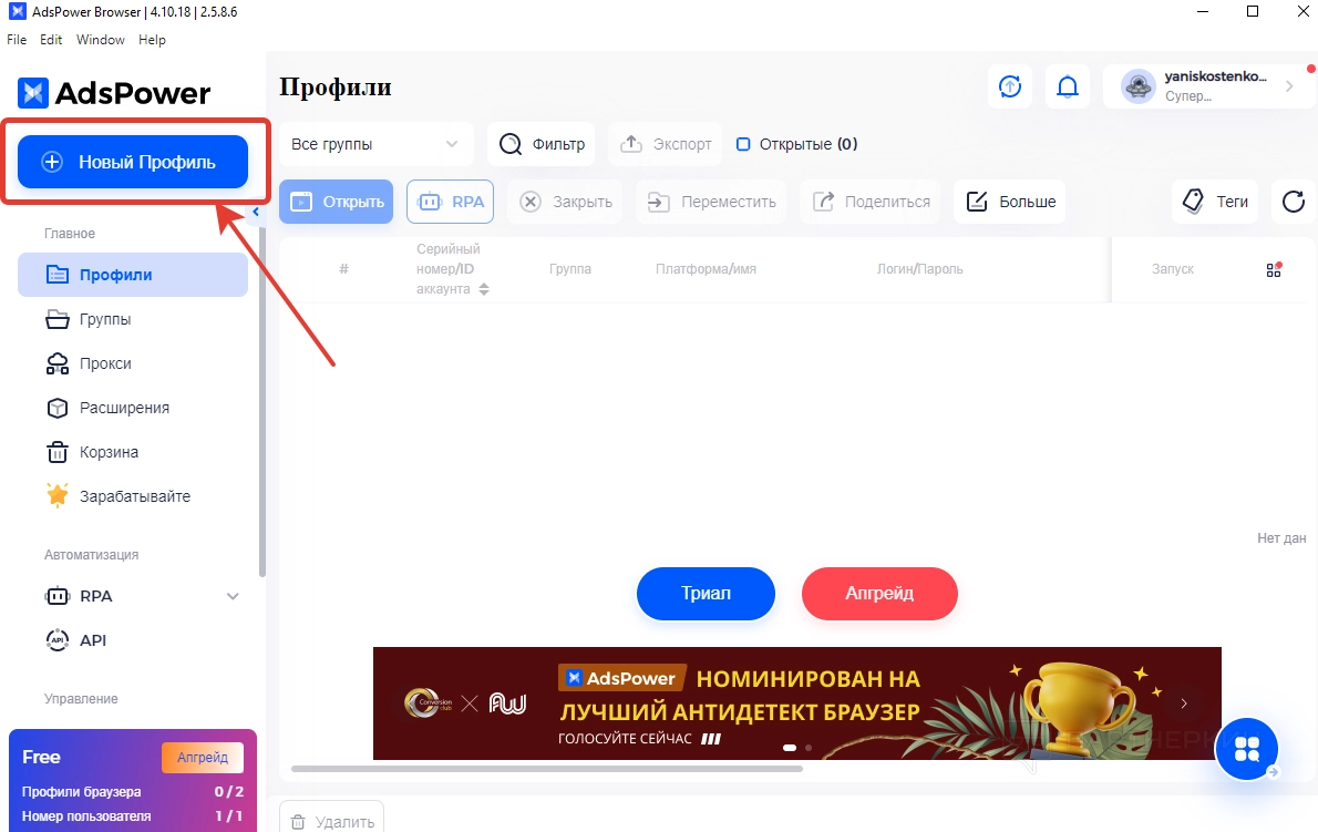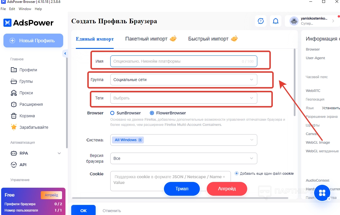 Настройка профиля Ads Power