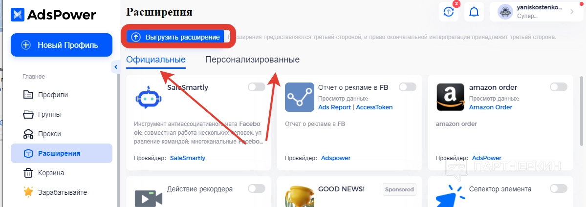 AdsPowerпо умолчанию. Среди персонализированных можно найти те, которые были загружены со стороны. Для загрузки сторонних расширений необходимо воспользоваться кнопкой «Выгрузить». На бесплатном тарифе данная возможность, к сожалению, отсутствует.