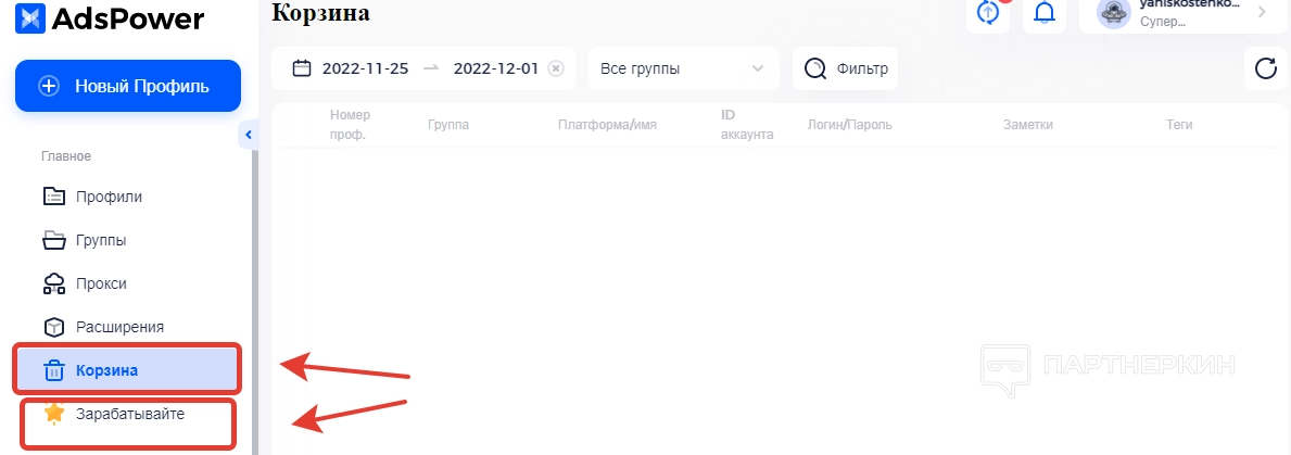 - Корзина . Здесь отображаются удаленные профили.