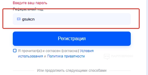 Выбираем удобный вариант и регистрируем учетную запись. Обращаем внимание, что при создании аккаунта система будет просить реферальный код. Перед нажатием на кнопку «Регистрация» даем свое согласие с условиями использования.