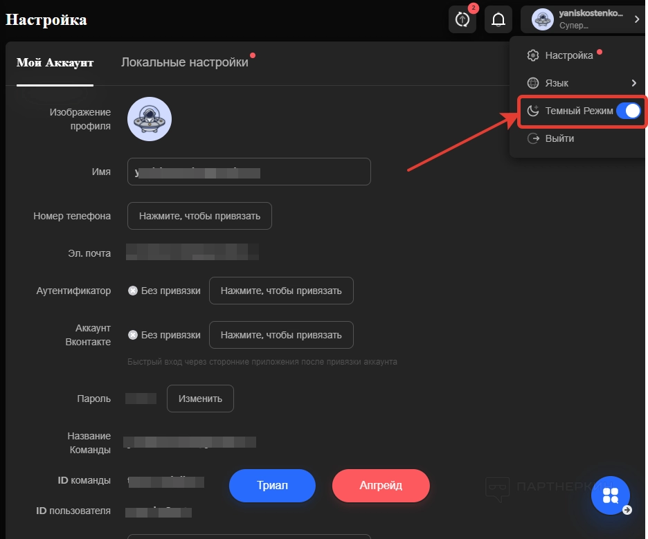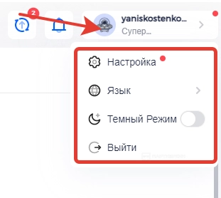 Настройки личного кабинета можно найти в верхнем правом углу. Для этого жмем на иконку с летающей тарелкой и видим выпадающее меню, в котором будут настройки, язык, темная тема и кнопка выхода.