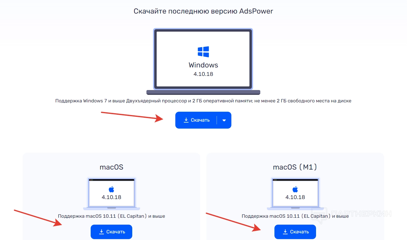 После нажатия на кнопку «Скачать» появится страничка, на которой нужно выбрать подходящую операционную систему. На момент написания статьи на выбор предоставлялись файлы для Windows, MacOS и MacOS M1.