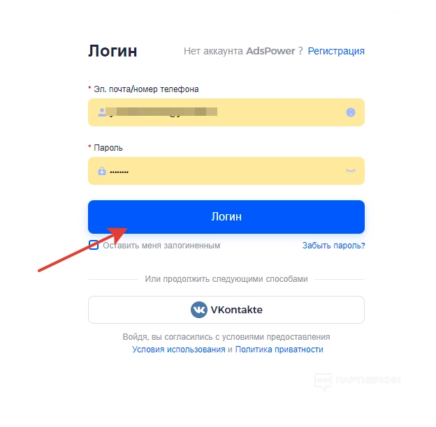 - с помощью аккаунта в Vkontakte.