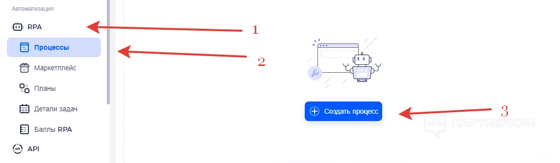 Чтобы выбрать действие, необходимо нажать « RPA », выбрать вкладку « Процессы » и кликнуть на « Создать процесс ».