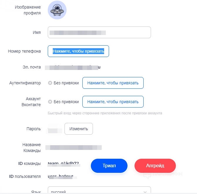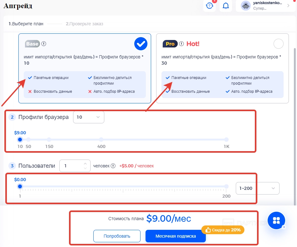 Если нажать на кнопку « Апгрейд », появится возможность приобрести один из тарифных планов. Обращаем внимание на калькулятор, который подсчитывает стоимость тарифного плана в соответствии с выбранным количеством профилей и пользователей. Окончательная стоимость будет отображена после того, как пользователь откорректирует все параметры.