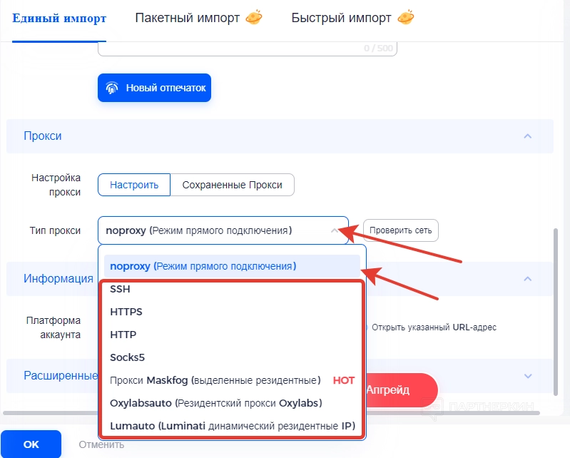 Ниже идет блок для настройки прокси. По умолчанию система предлагает использовать « noproxy », что означает работу браузера в режиме прямого подключения. Но если необходимо ввести свой прокси, нажимаем на стрелочку для развертывания списка, выбираем нужный тип прокси и вводим данные.