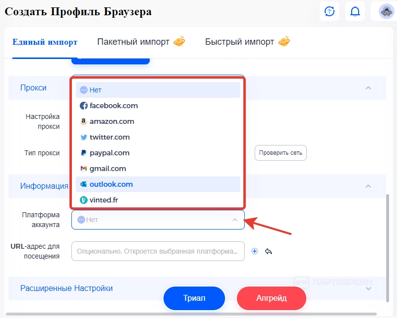 Последний блок — выбор платформы или сайтов, с которым намерен работать пользователь. Для этого предоставляется строка, в котором можно подобрать необходимый ресурс. По умолчанию в систему встроено более 15 сайтов, которые можно выбрать без ввода адреса. Чтобы выбрать необходимый вариант, просто жмем на стрелочку и указываем сайт.