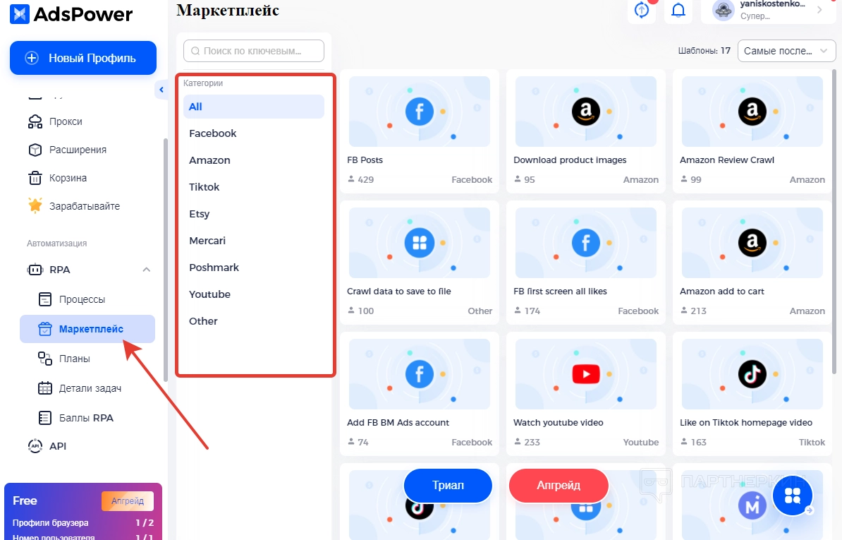 Ниже есть вкладка « Маркетплейсы », в которой можно приобрести шаблоны процессов под разные площадки и социальные сети.